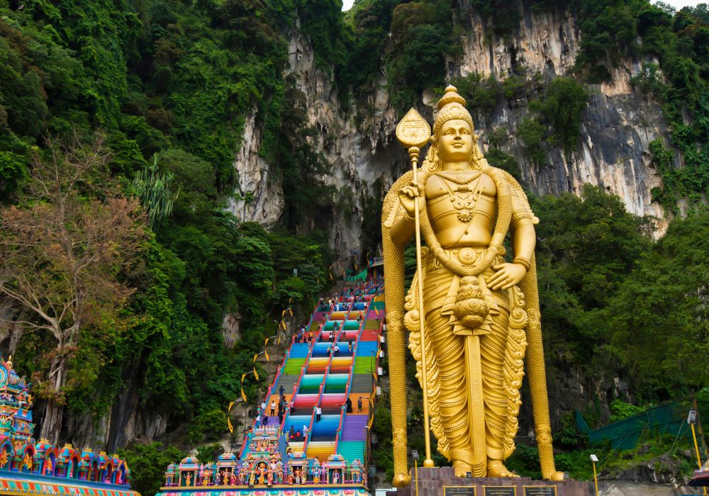 Cultural encounter at Batu Caves – famous Hindu shrine with a giant golden statue.