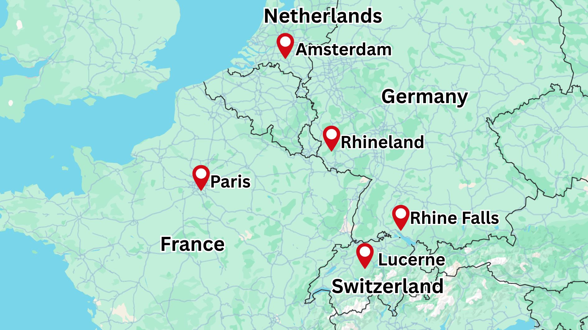 Amsterdam, Cologne, Rhineland, Black Forest, Rhine Falls, Lucerne, Basel, Burgundy wine region, and Paris.